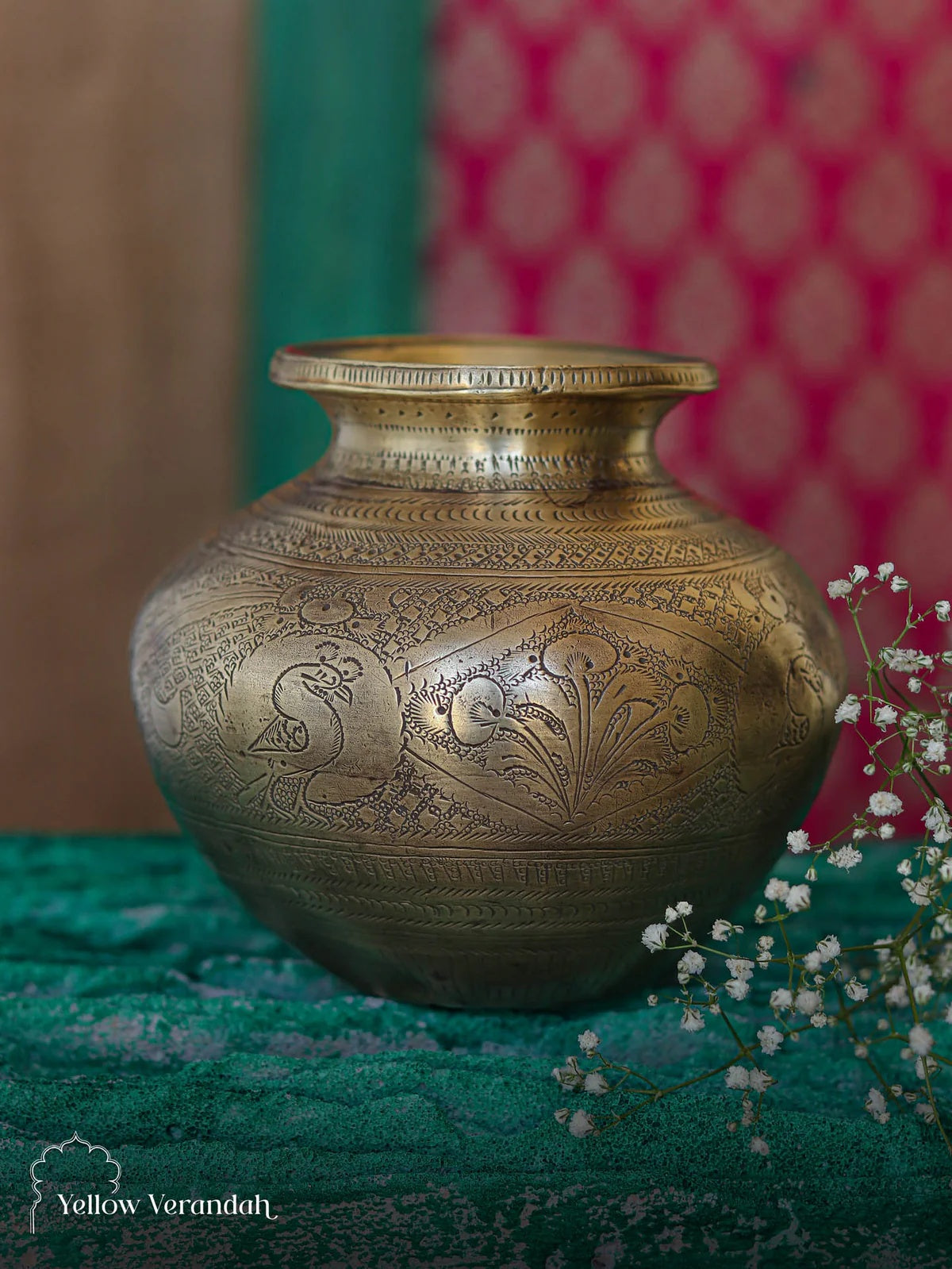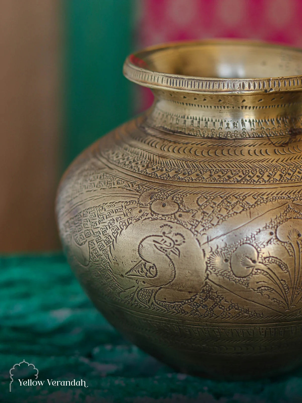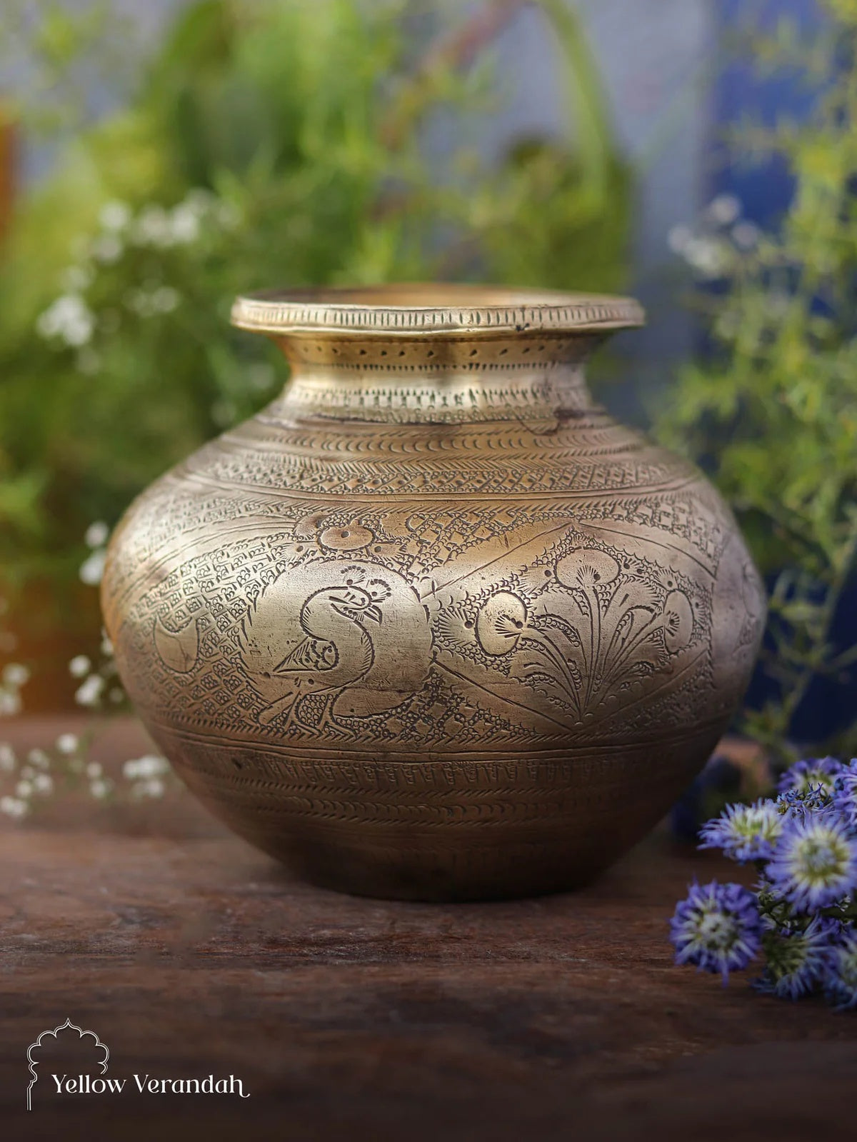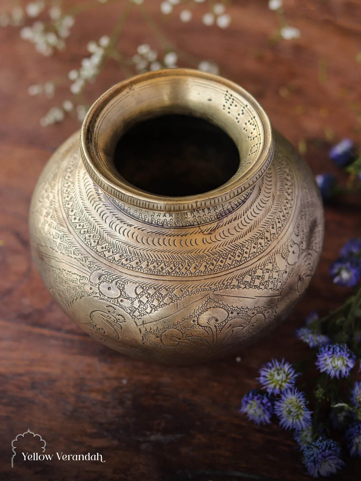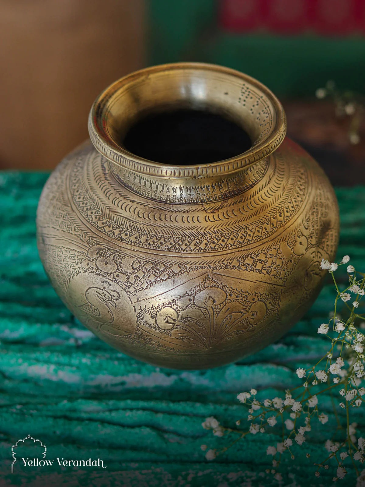 This handpicked Vintage Brass Carving Pot is an old collection from 19C Rajasthani Royal Colonial era - a legacy from Haveli culinary & culture.