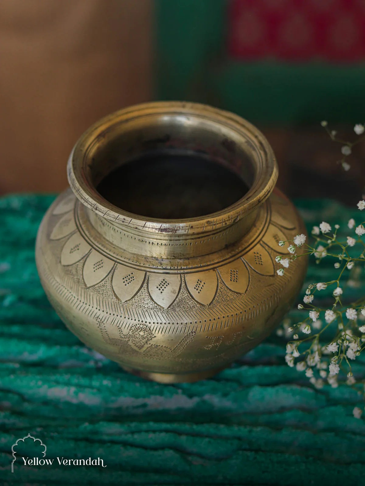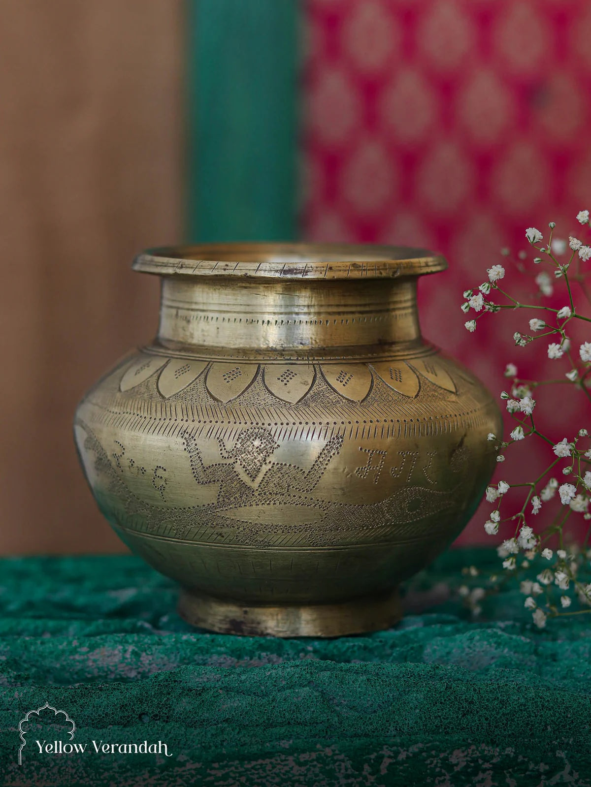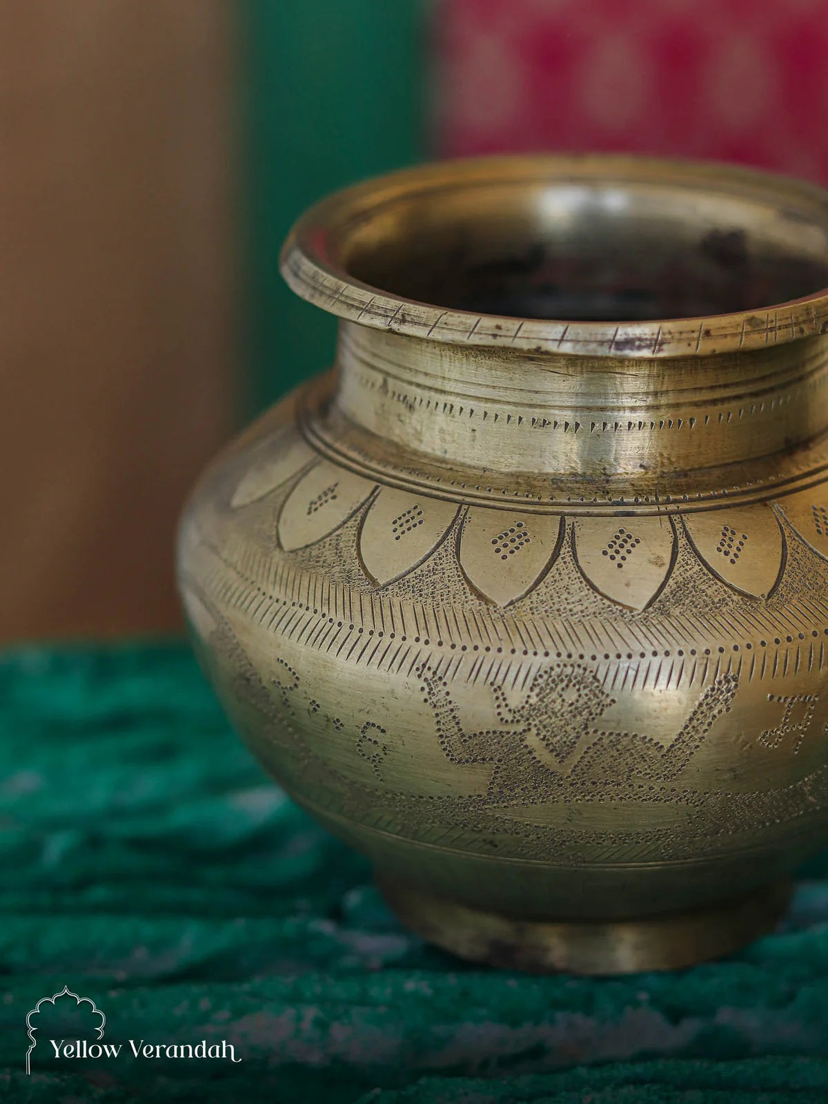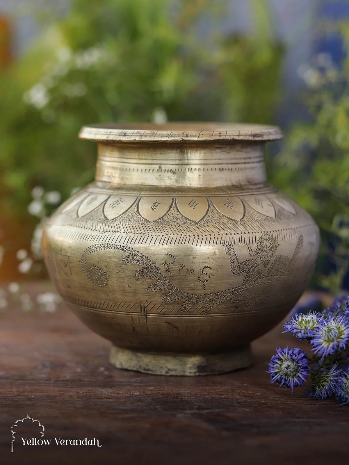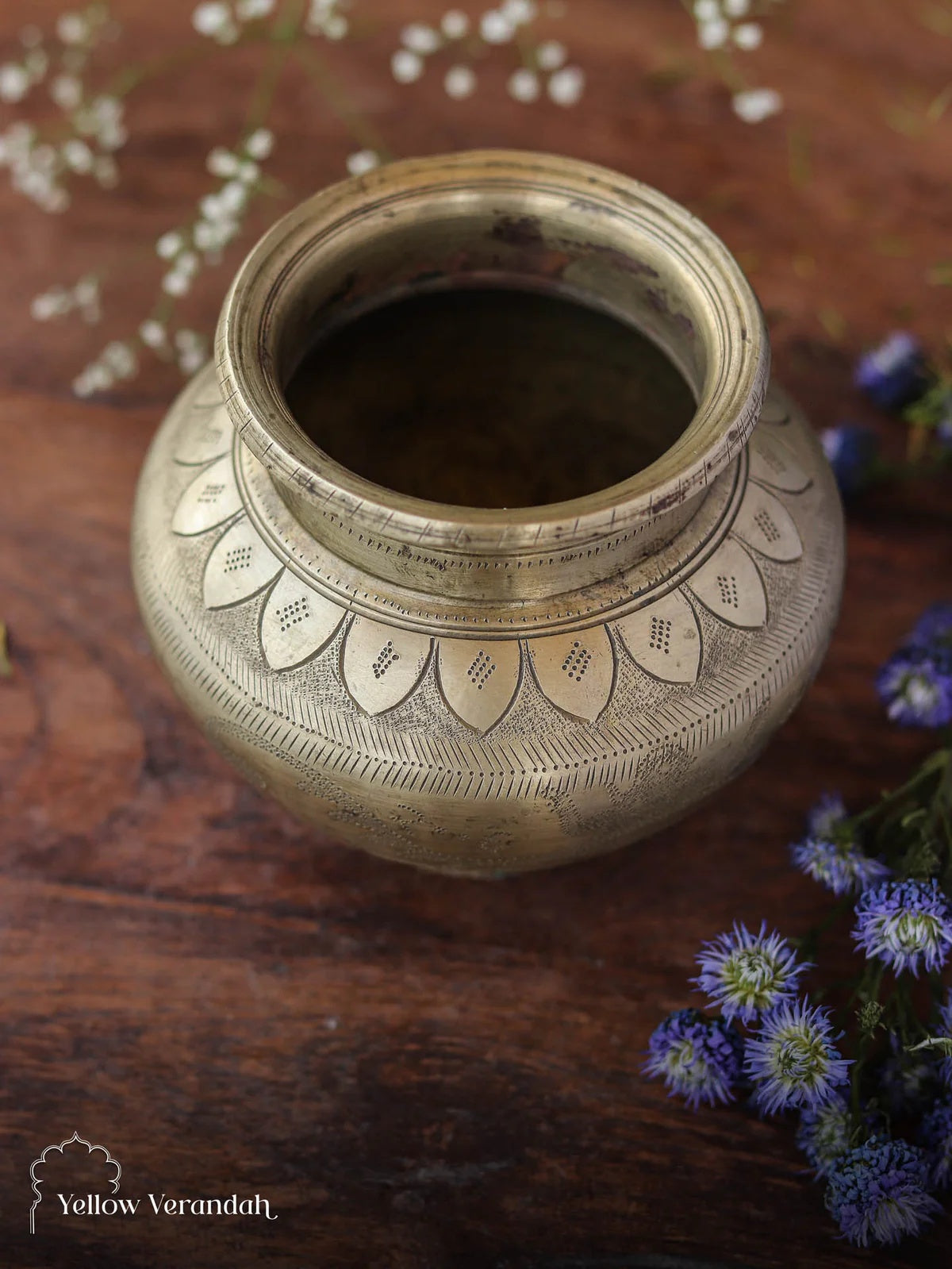 This handpicked Vintage Brass Carving Pot is an old collection from 19C Rajasthani Royal Colonial era - a legacy from Haveli culinary & culture.