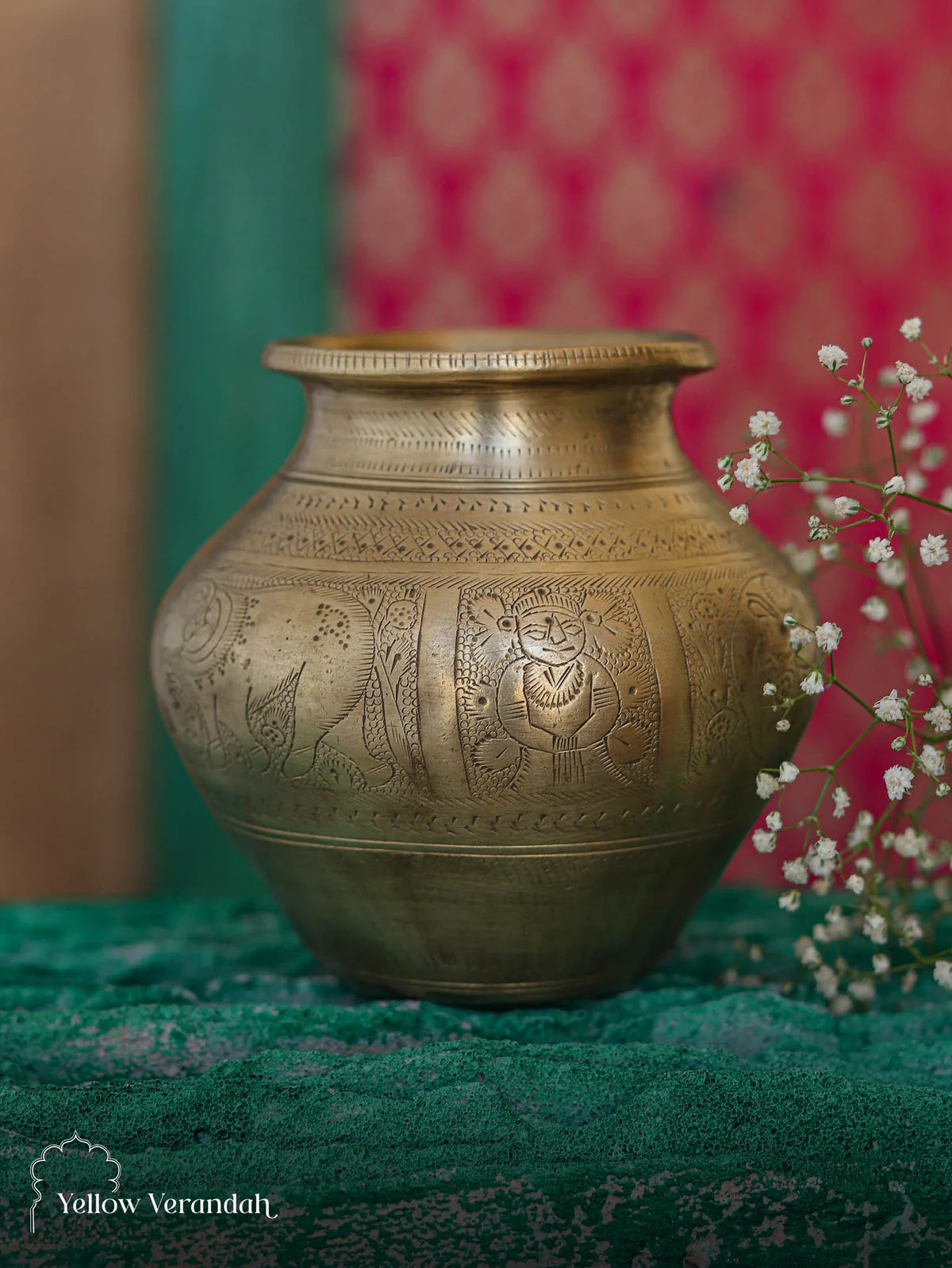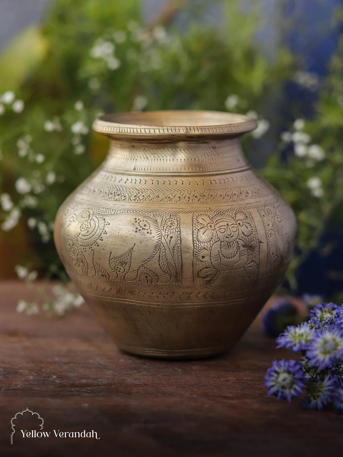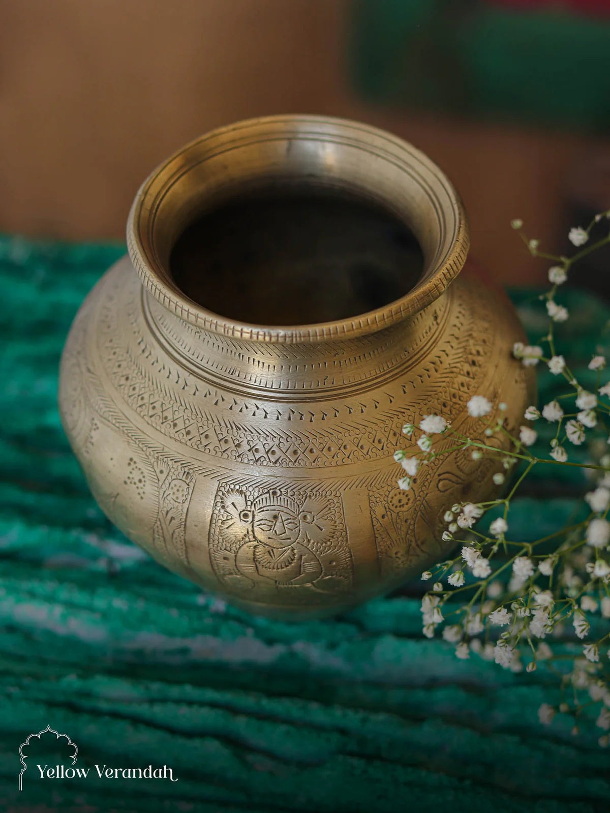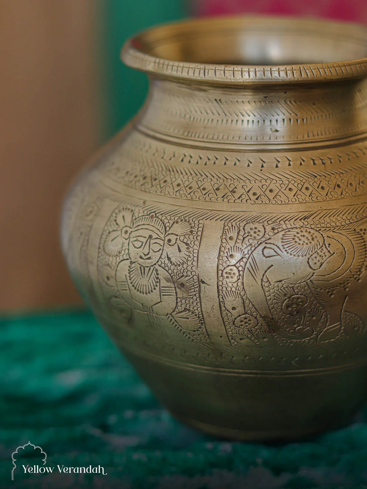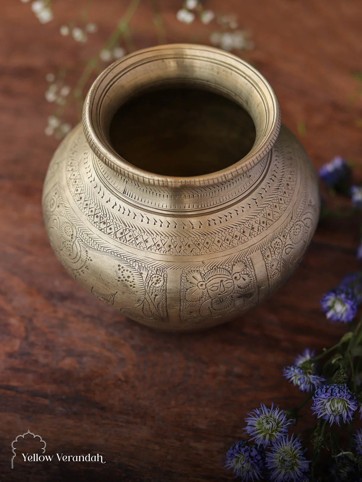 This handpicked Vintage Brass Carving Pot is an old collection from 19C Rajasthani Royal Colonial era - a legacy from Haveli culinary & culture.