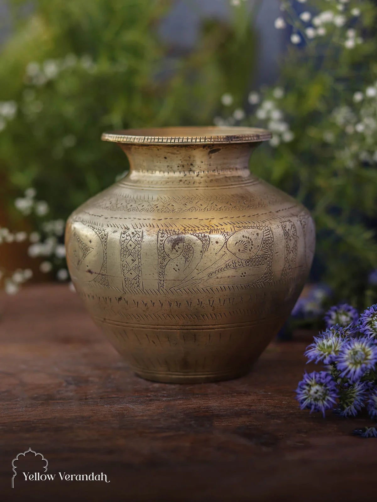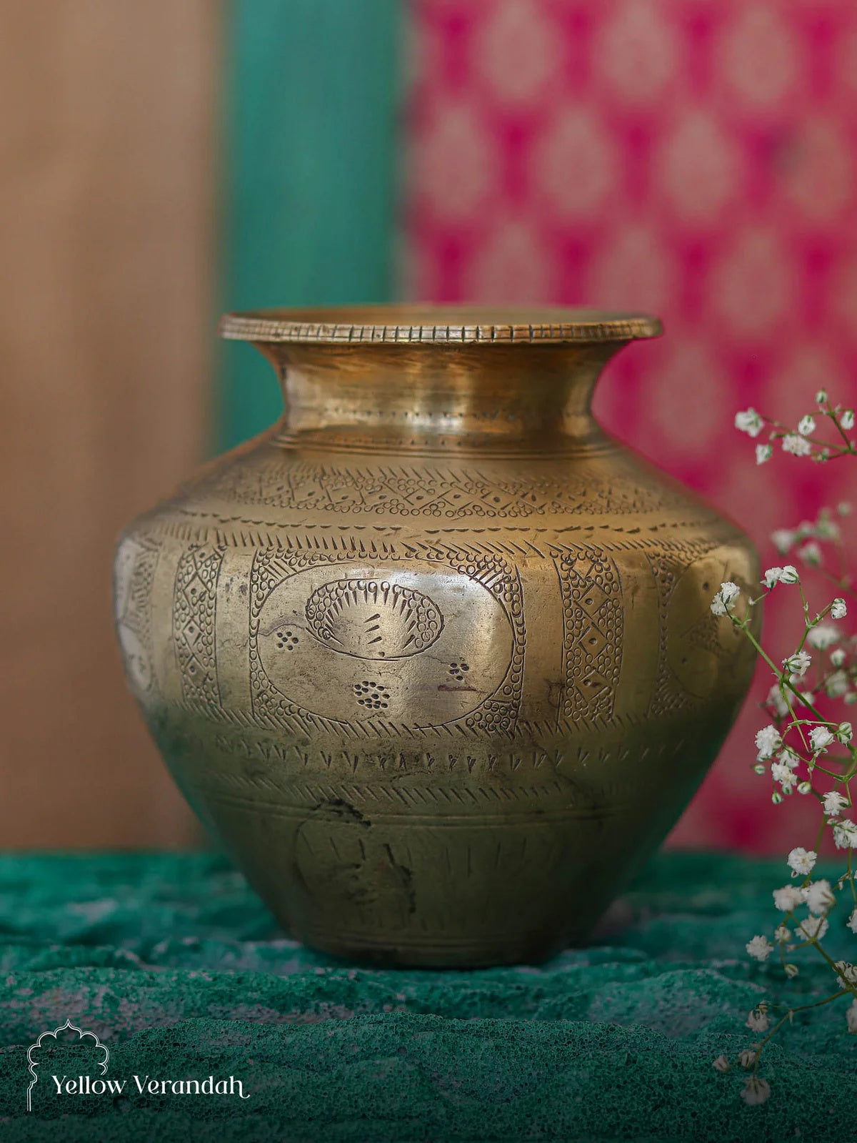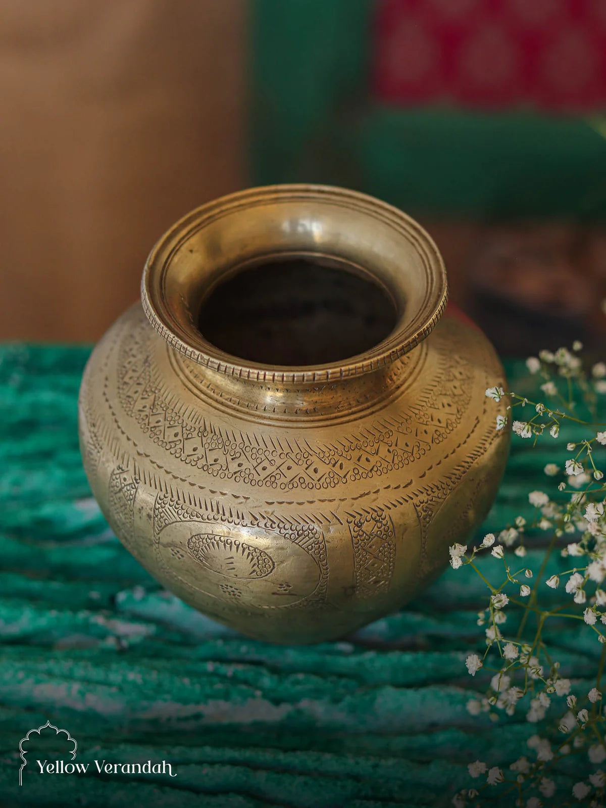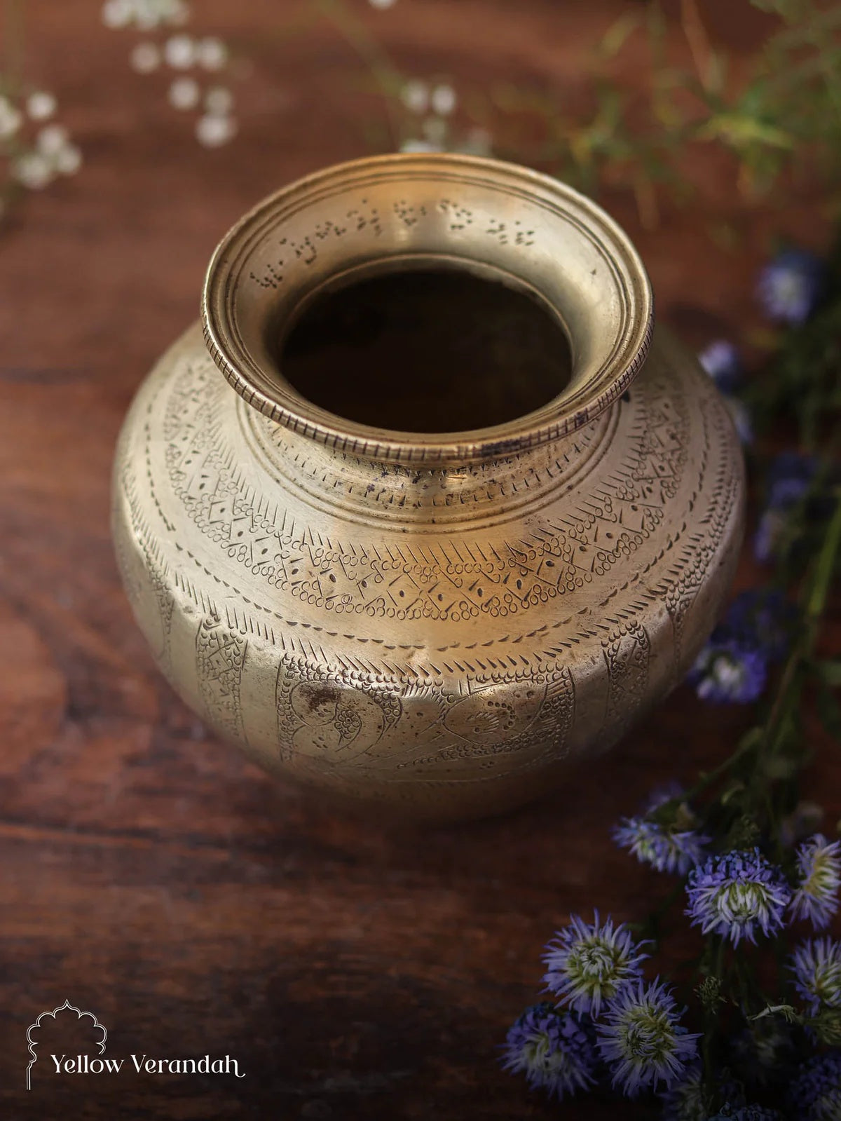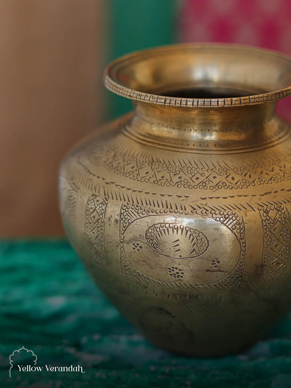 This handpicked Vintage Brass Carving Pot is an old collection from 19C Rajasthani Royal Colonial era - a legacy from Haveli culinary & culture.