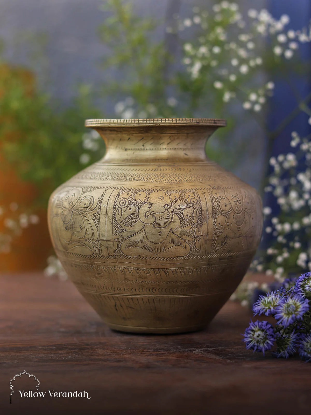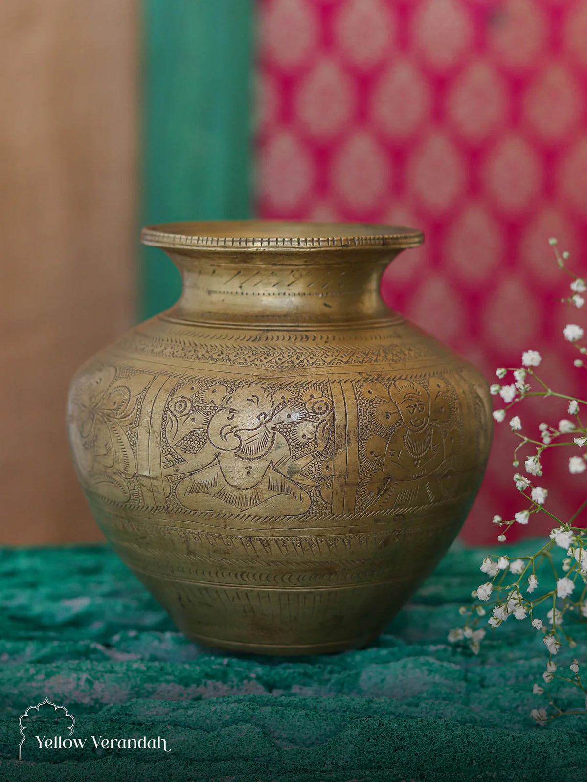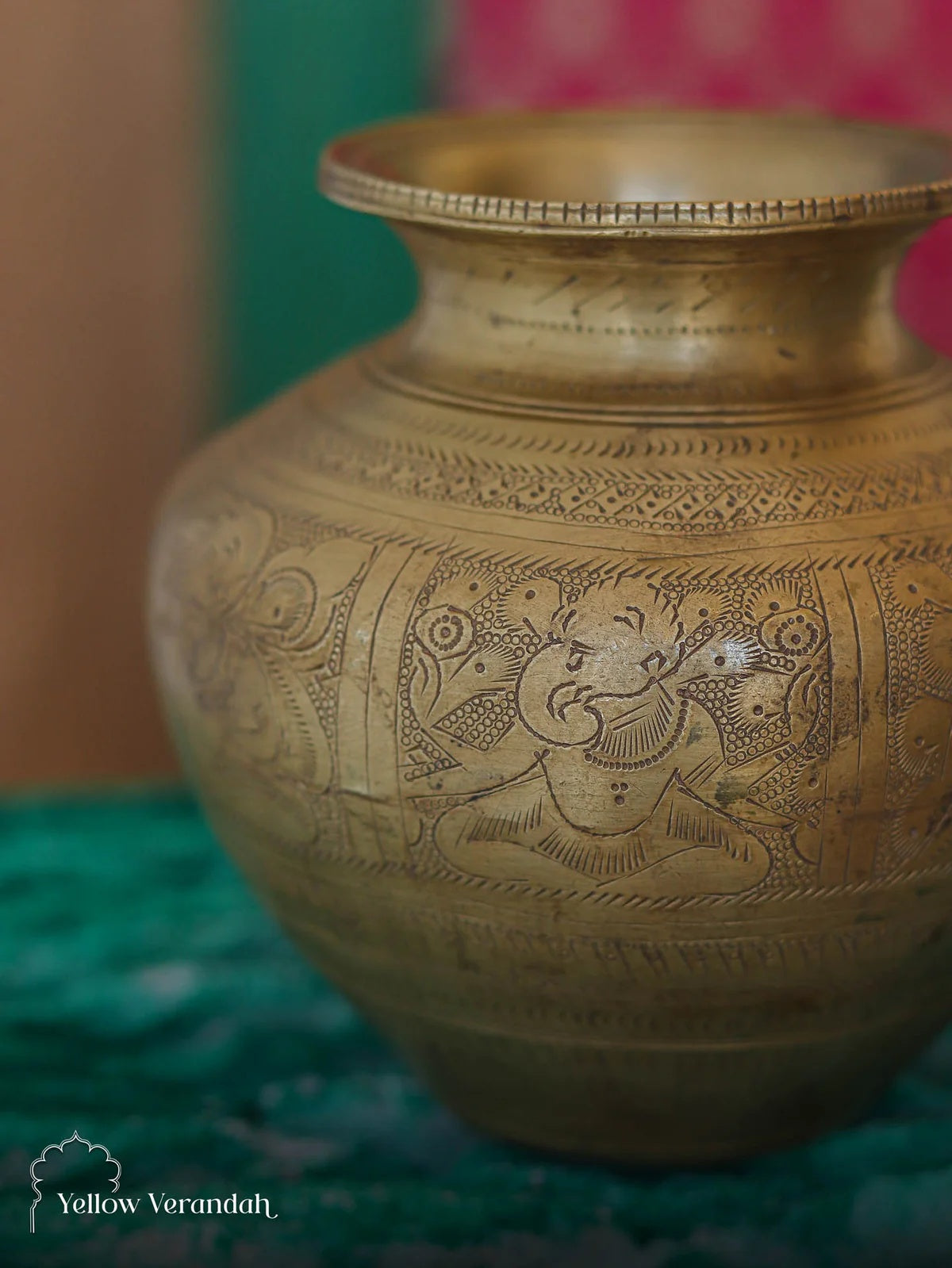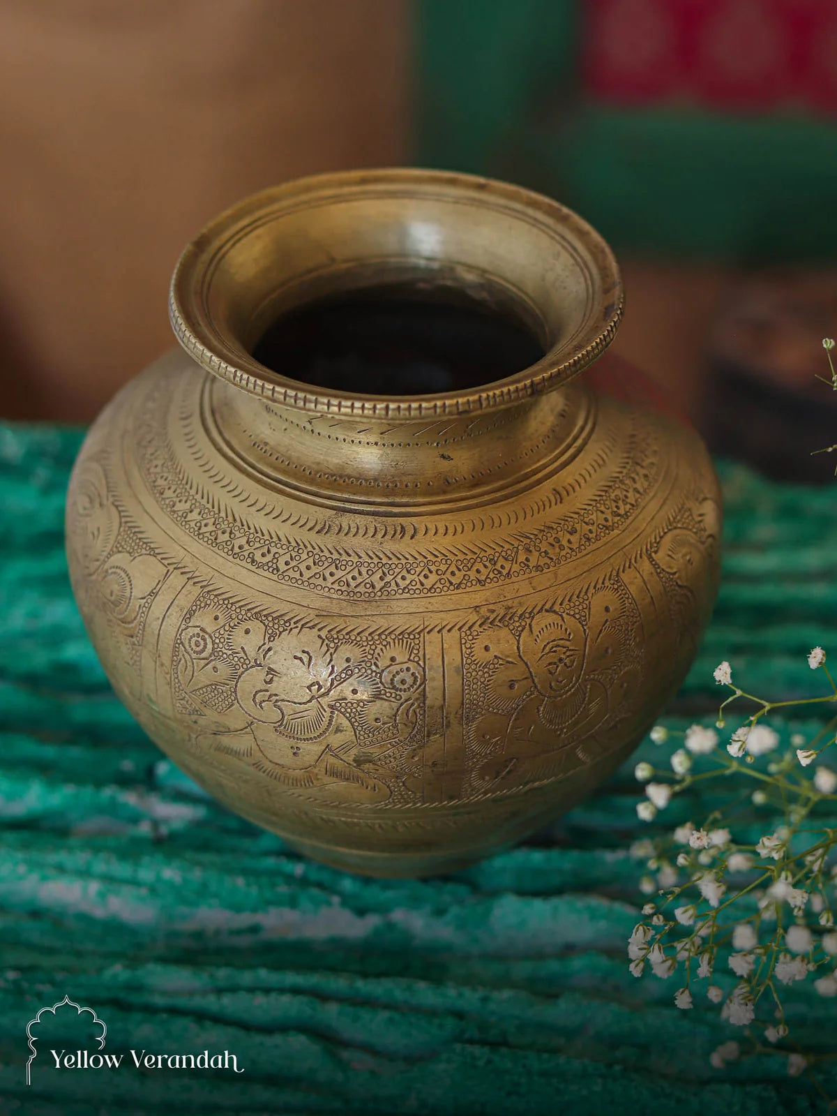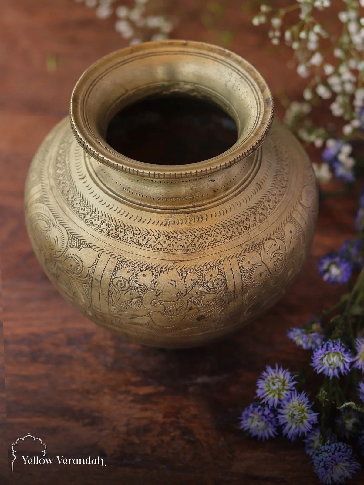 This handpicked Vintage Brass Carving Pot is an old collection from 19C Rajasthani Royal Colonial era - a legacy from Haveli culinary & culture.